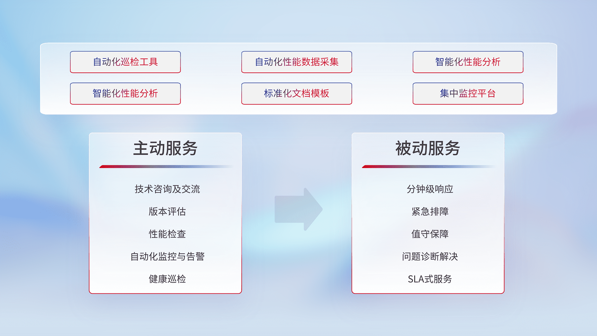 智能化工具和标准化文档,,保障服务质量,,,提供主动服务(包含技术咨询、、、、版本评估、、、、性能检查、、、、自动化监控与告警、、、、健康巡检)和被动服务包含(分钟级响应、、紧急排障、、、值守保障、、、问题诊断解决、、SLA服务)。。。。