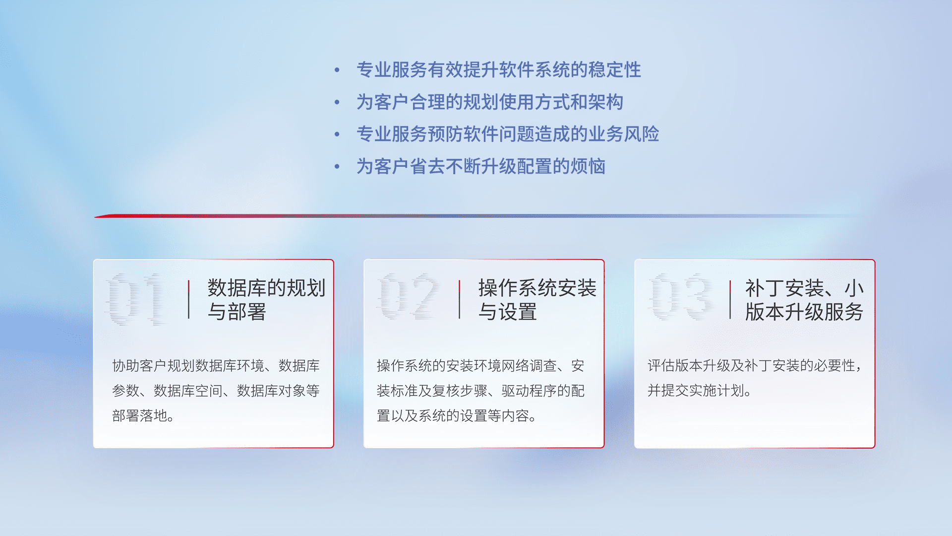 为客户提供软件规模升级、、、快速部署、、按需配置的专业服务,,,从数据库的规划与部署到操作系统的安装与设置,,,再到补丁安装和小版本升级提供支持。。。